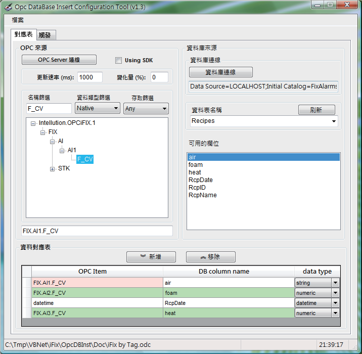 透過啟動trOpcDBInstCFG.exe設定Tag與資料庫欄位定義 可呼叫模組視窗查看一些訊息